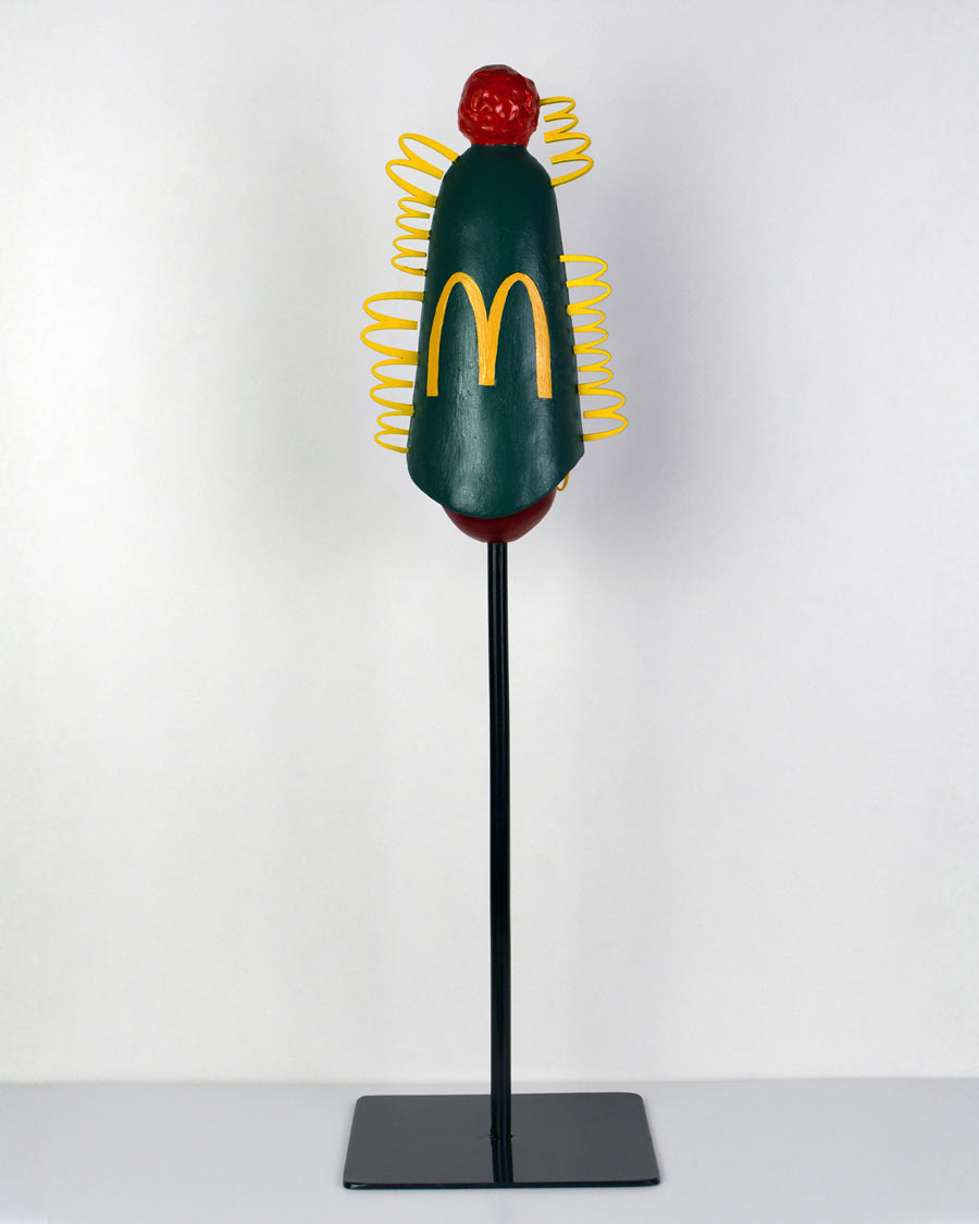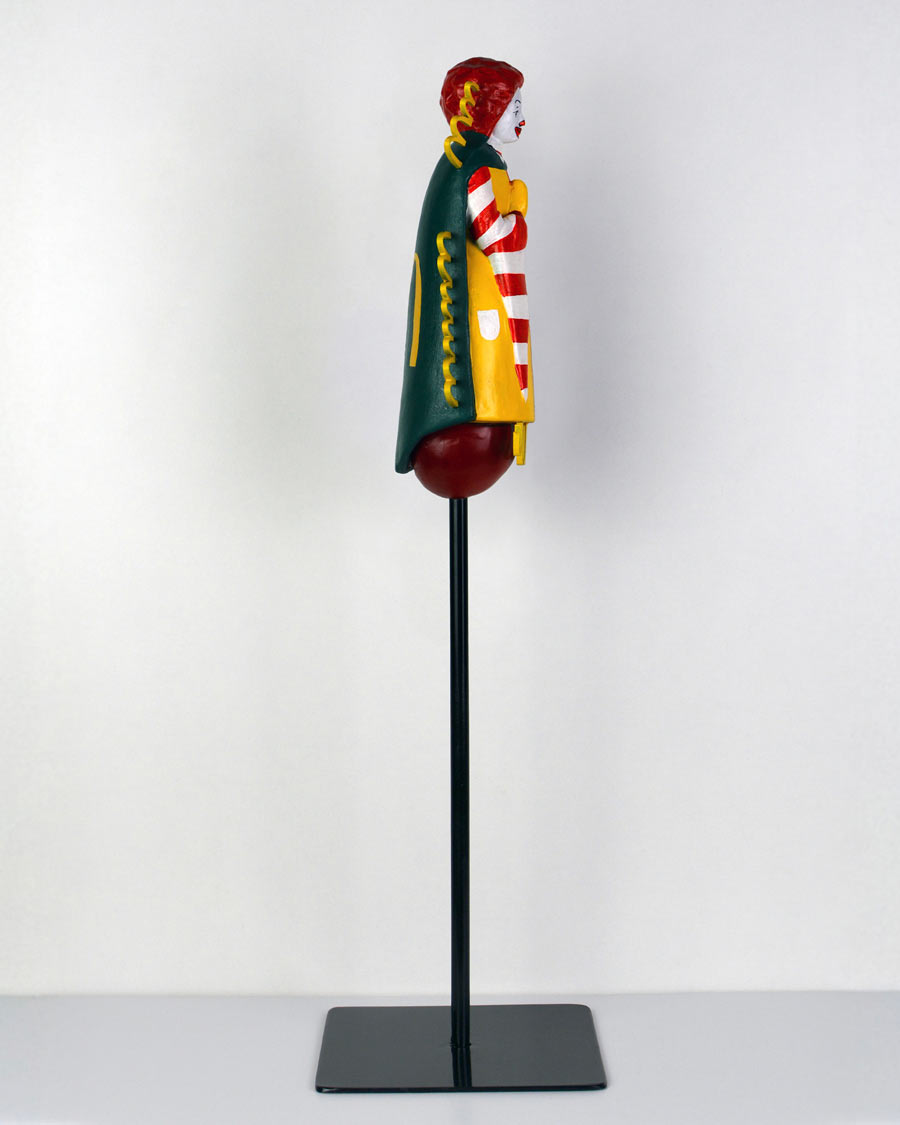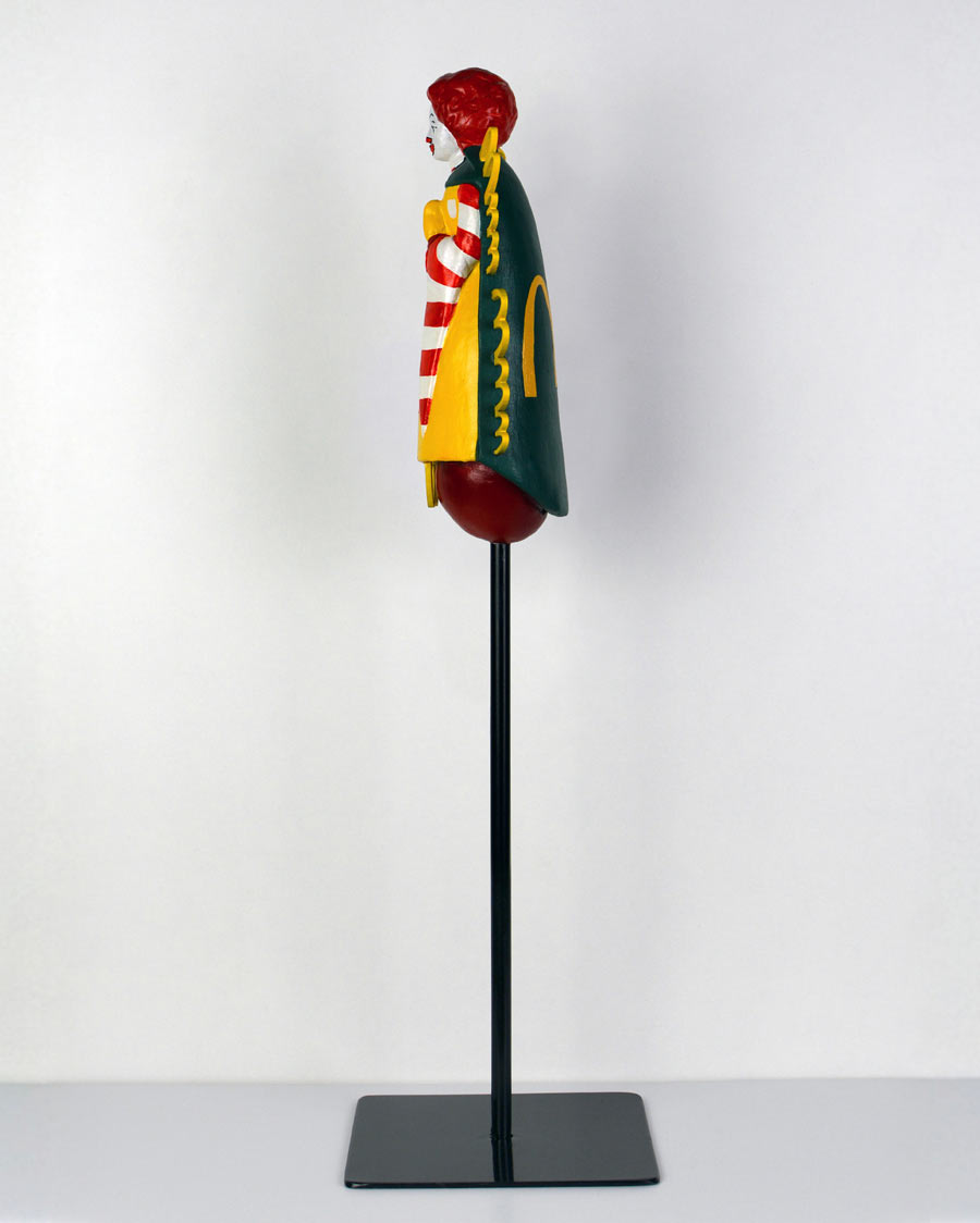 Resina y madera cortada con láser policromada. Peana de hierro.