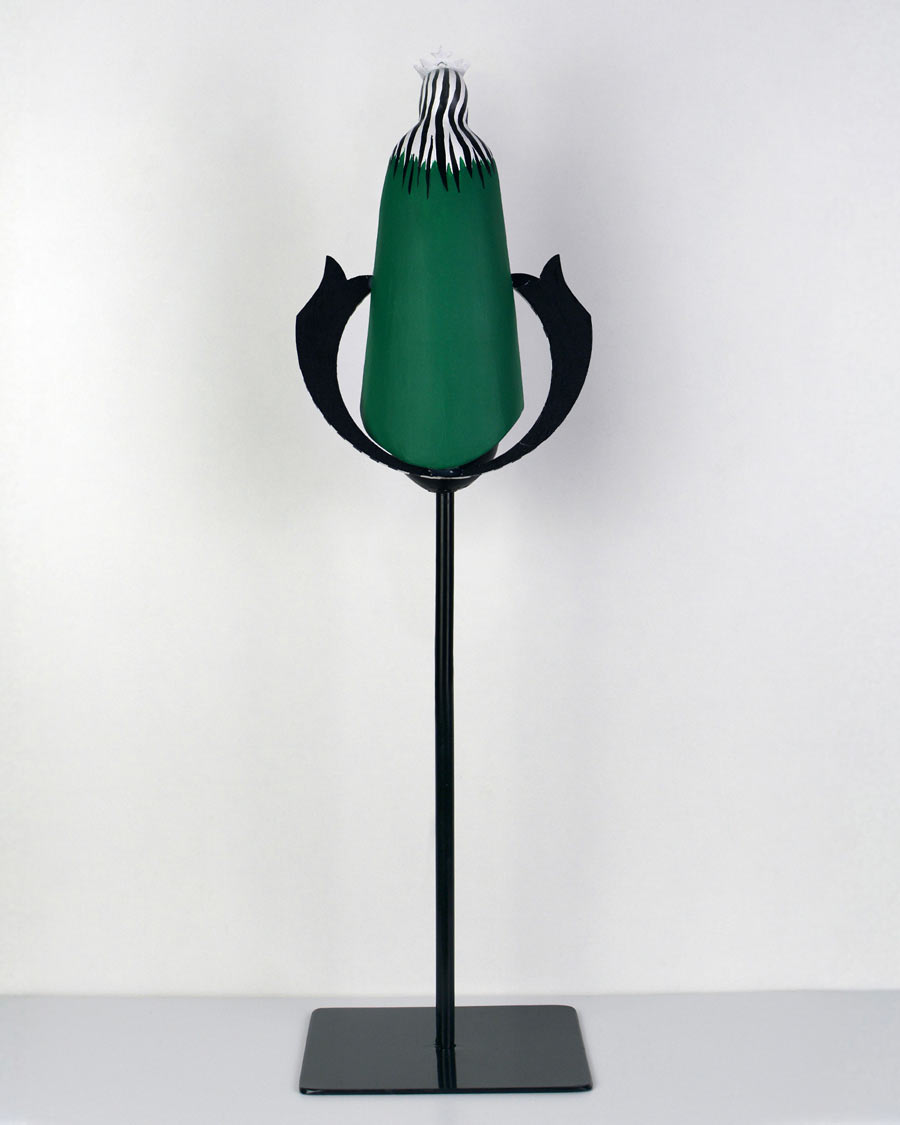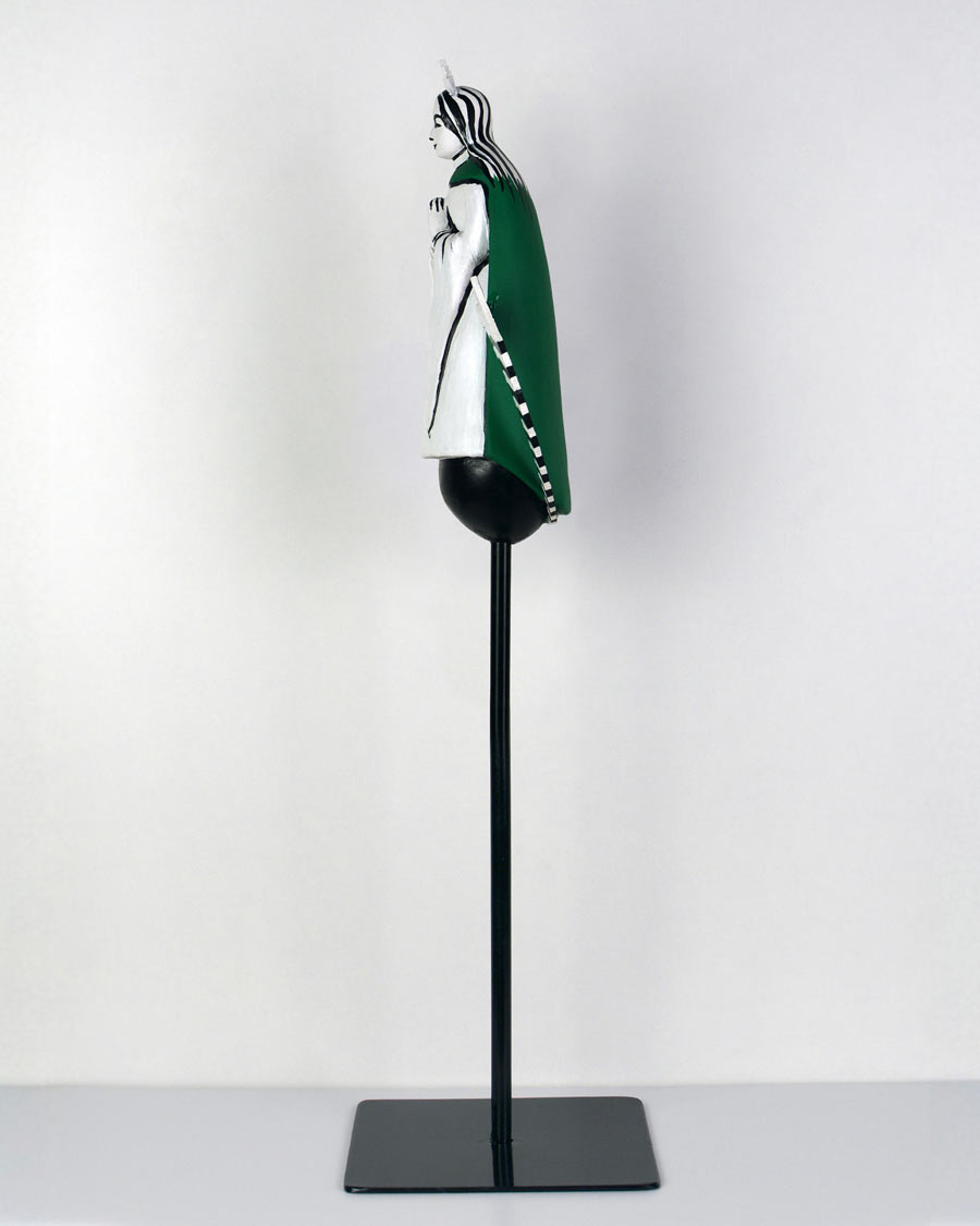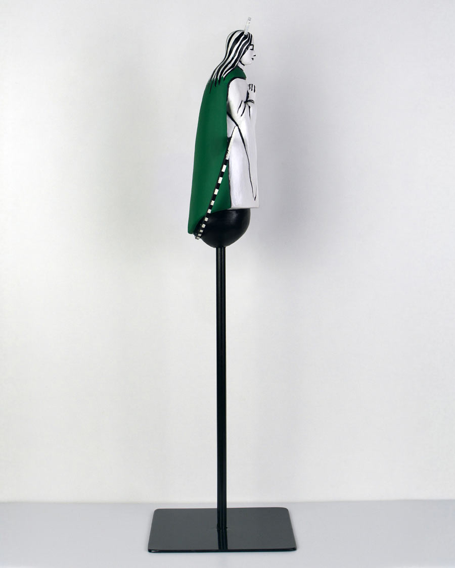 Resina y madera cortada con láser policromada. Peana de hierro.